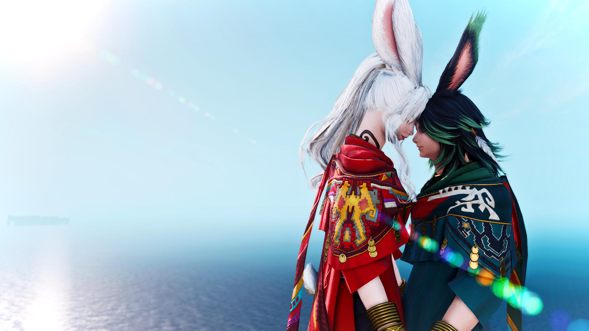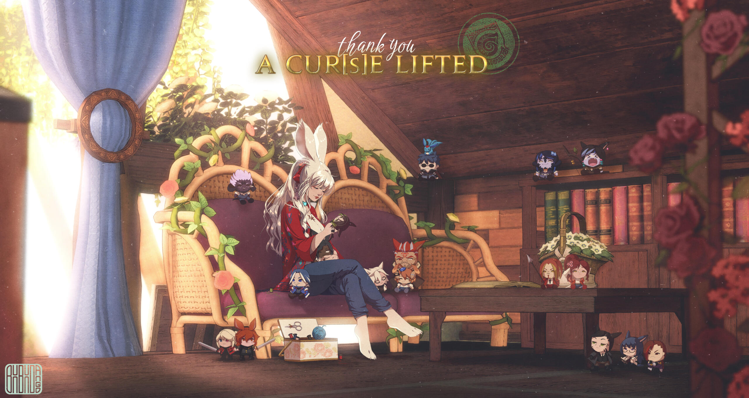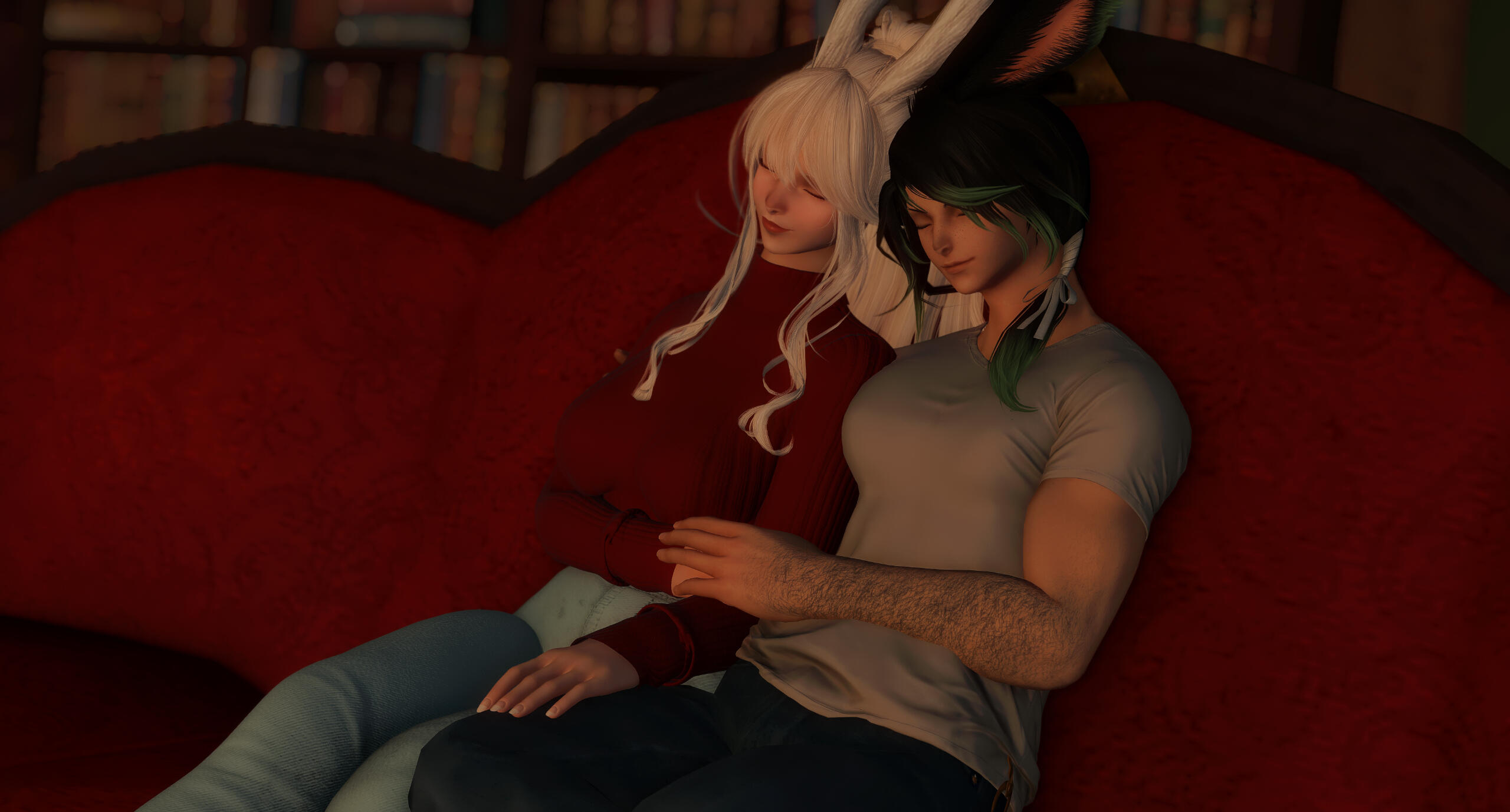 The silent ladybun slowly learned how to walk by her own in this new life given to her. Her struggle against the gloom of her past and initial lack of belief in true happiness were tempered by her renewed curiosity of the Star. Small joys, new encounters, bonds, hardships, doubts, the nuances of existence she tasted little until now.And so, at long last, she felt the wind of changes and soared. New faces replaced the old ones of friends lost in sight. But for the very first time she choose the path she wanted to walk. After much research and inconclusive self-teaching, she managed to find a thavnairian dancer teaching their art. Gradually, she spent less time inside with her clothcraft tools, and more outside learning the ropes of an adventurer. But she never thought the treasure she dreamed for so long was right next to her.A friend met in the oddest place, someone sharing her longing for exploration yet sharing the woe of inexperience. The veena named Kisne and the bnnuy spend increasingly time together, be it in a library, in front a nice cup of hot chocolate or taking on small missions for rookie adventurers. Trust grew, alongside a far deeper bond... But it took long for the two oblivious bun to realize its nature.For the first time of both their long life, they felt love in its purest form. His affection knows no bounds, and so the care and patience as the bnnuy struggles with the lasting effects of her past. Yet by gestures and touch, she displayed her own feelings she was unable to completely utter.Working together, then living under the same roof only confirmed their hearts' desire : weaving their path as one, for the centuries to come.Yet, their newfound idyll didn't stopped life throwing lemons baskets at them. During their first romantic vacations in the remote Werlyt coast, misfortune struck : a defective Fete's firework landed on the couple's abode... Burning the cottage beyond repairs before any help arrived.