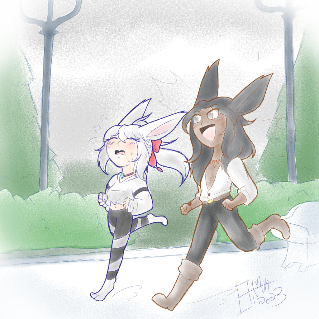 Growing comfortable in her new life and modest home in the attic, Ethel diligently trained her steps as an apprentice hunter. Deployed as scouts in the Turali wild, her and Kisne turned out as a reliable team, if not perhaps too keen to take a day off by a hotspring. Hardships awaited the mute though, as brief engagement with local fauna then a spar put stark light on her own limitation. She didn't had time to brood much though, as a certain viera invited her one night by the Lomisan venue they met for the first time.