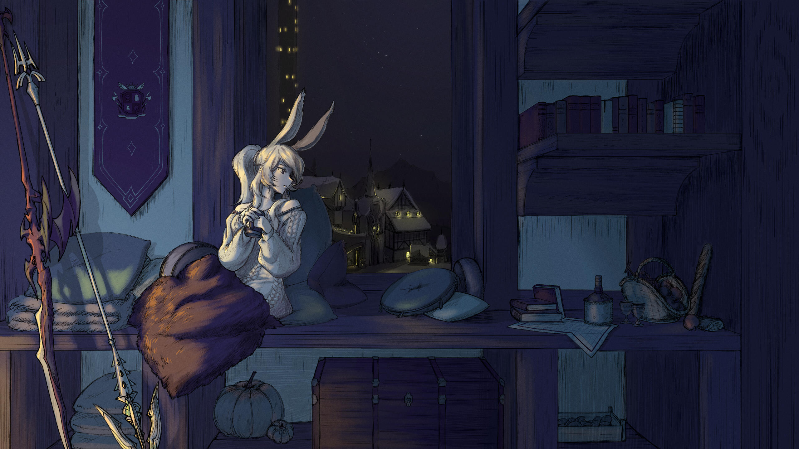Blessings came in series for the newlyweds. After many unfruitful attempts to buy a plot of land in Gridania, luck (or perhaps someone pulling strings in the background) was on their side. A small area for their taking, conveniently close to the hunter guild employing them ! They didn't lost time, eager to build together their love burrow. As soon the walls were raised, they started the interior design. Of course, the room they spend the most on was... the bathroom, looking closest to an interior onsen !All the extra space compared to the attic they rented also gave her some ideas about starting family, but they decided to wait further, time to make enough savings and ensure their already loved little one wouldn't lack anything.