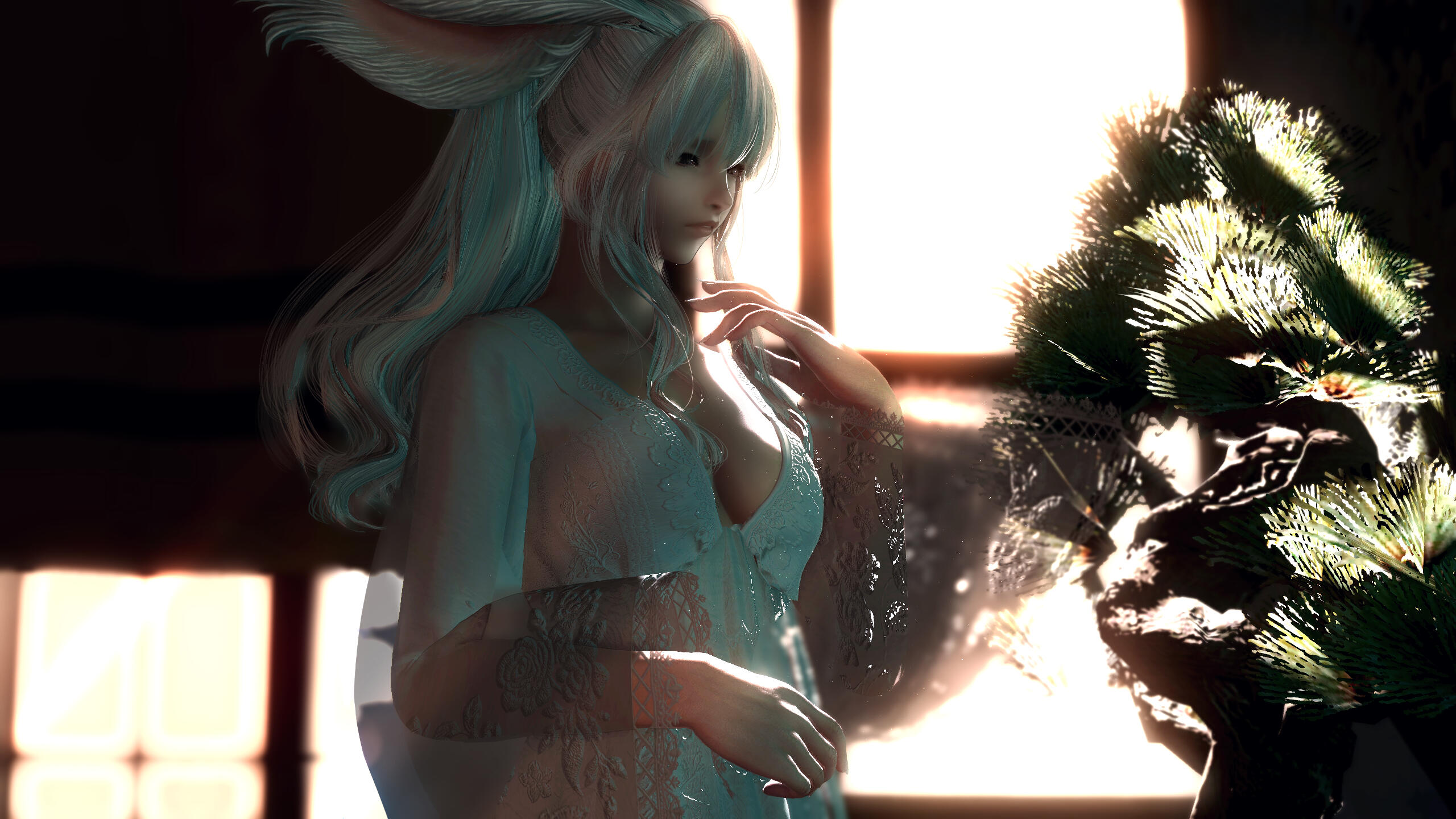 Her body broken once more, she welcomed her final rest in cold and silence. But it was once more to be denied by her precious friend, finding her lying against the slain dragon, armor pierced by one of his claws. For long, she wasn't sure how exactly she survived. The few clues she glimpsed years later left her with more questions than answers.She was mended in the walls of the Holy City, this time with consideration from her order. Peace finally came to Isghard, and winds of change… She wept for all those lost before being able to see their sacrifice bear fruits. Her crystal lost, her strength diminished, she earned to retire as a full citizen and learn how to live as such.In need to make a living, she took on clothcraft for one of the Crozier’s guilds, diligently learning. Content with a low-profile and modest life, she found small happiness for the first time, taking up house duty the evenings in the abode shared with an aging Yvain. Slowly she saw years gnawing away his strengths where countless battle failed to do so. An heartbreak for the veena, with the unavoidable issue she refused to acknowledge.The ageless lady hid him her own woes. Year by year, her own body weakened, her senses dulled to the point only permanent cold inhabited her. A stigmata from the war perhaps, but also the gruesome state of her back as permanent reminder of her time in Ul’dha. Fighting for the City only accelerated the process of her decline, now catching on her.And then the dreaded time to say farewell to Yvain came, the old man making her promise to live on and search for happiness. But it was too much for the grieving veena. Despite the last benevolence of giving her a small house in the Firmament as legacy, Ethel remained inconsolable for months. Despite her efforts, the abode always felt empty of any presence she needed so much…Slowly but surely as year passed by, the lady tried to make up to her promise, visiting the other city states and venues to make connections. Even establishing herself as independent weaver, now capable enough to serve a clientele of workers, even nobles up to Sky pirates praising the sturdiness of her garb.She made friends by many trials and errors, even started to feel her heart race for someone... but despite elaborated potions, her state turned to the worst. Where lashes and battles failed, the slow leak of her aether was killing her.