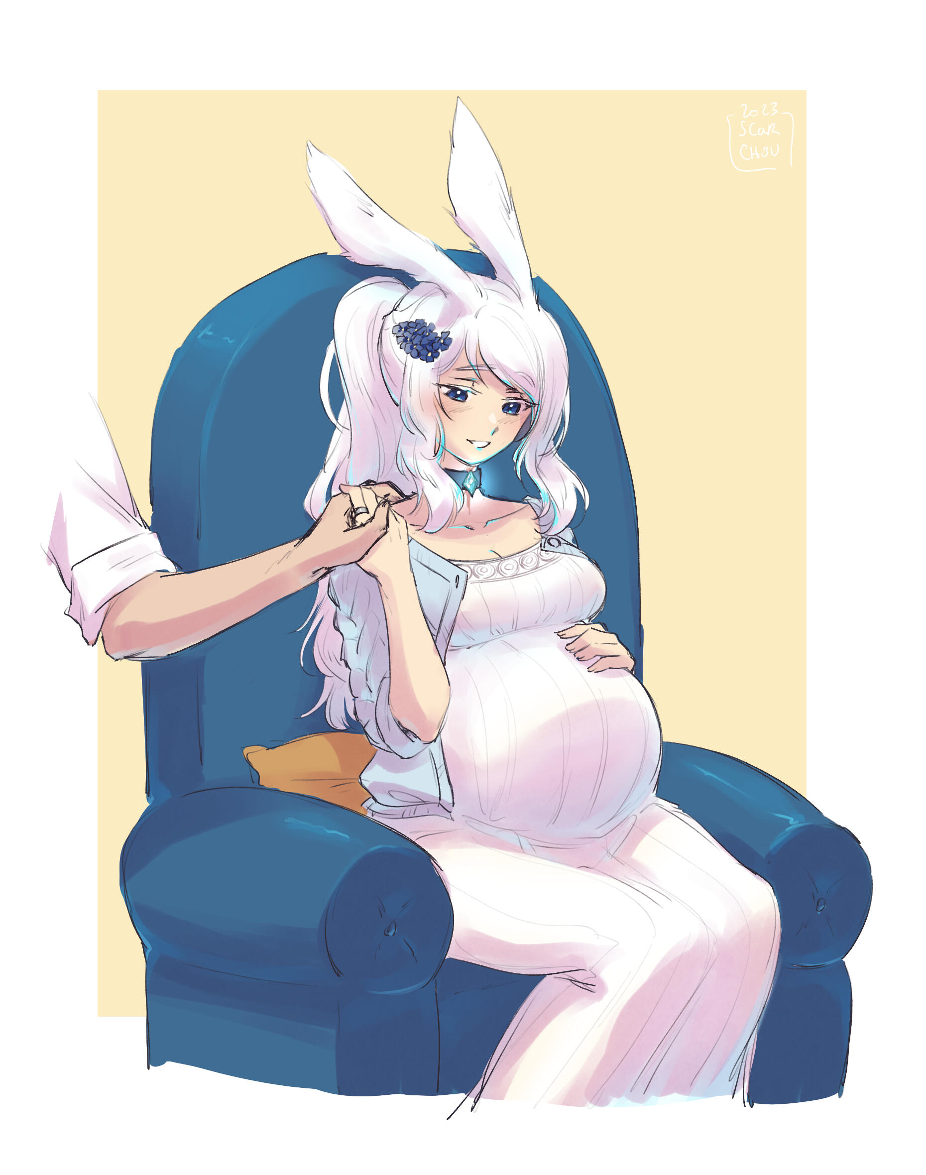 By all means, Ethel never knew this degree of happiness before, making her very thoughtful of nurturing her bonds. Alas for her, her eagerness to prove herself useful for the company employing her backfired. The snow veena was utterly crushed in a spar against another dancer, in a way making her feel the pointlessness of her training. In short succession, she accumulated what looked like small failures, but definitively eroded her nascent self-esteem. Until it became too much for her to bear, and the couple took the decision to retreat from active duties. Instead, she took on managing tasks within the company, while Kisne embraced his old magiteck love by running the workshop full of troublesome mammets. For now, she would put down her chakrams in a rack alongside the spear, unsure she'd ever use them again.Even harder was the separation with her beloved, dispatched one month away for an important task in Tural. Each day felt a moon for the bonded vieras. As much their reuniting was sweet, this trial made them swear to avoid any other occurrence at all cost. All those events made them reconsider their family project... But as much she wished to, the snow veena's was questioning her ability to nurture life. The medics soon confirmed how slim chances were due to her past wounds, dealing heavy blow to her moral.Be it by the invisible hands of the Twelve or simply the unconsidered factor of her husband, the grim prediction was proved wrong in mere weeks after they started trying for child. At first, she brushed away the early signs, refusing to give on false hope. It tooks couple baffled healers to finally make certain the good news : she was expecting. Nothing, even the aether complications and worrisome traces detected within her body managed to cover the future parent's joy.