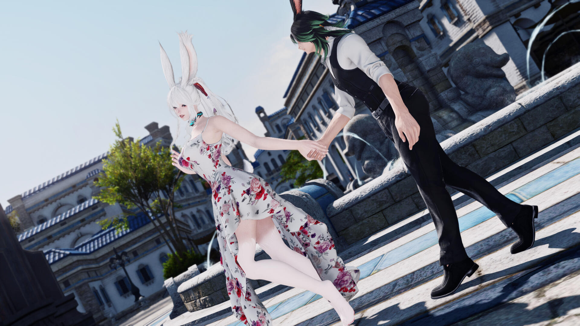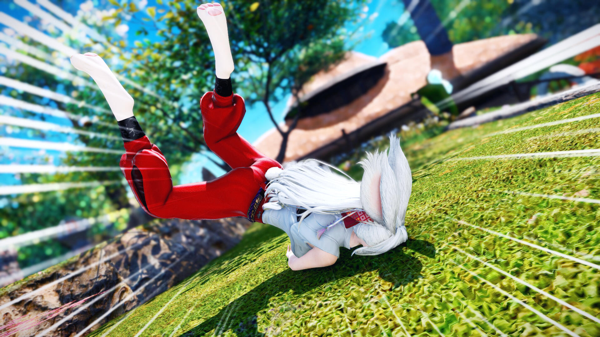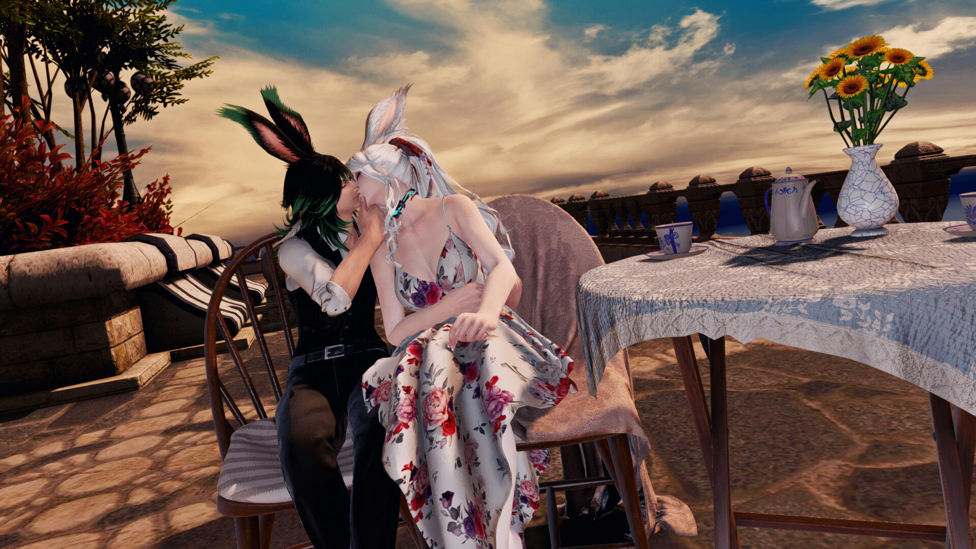 The oblivious viera remained completely wordless to his proposal, causing him a brief fright. Her dive for a hug making them roll on the grass was however a satisfying -albeit cloth-staining- answer !