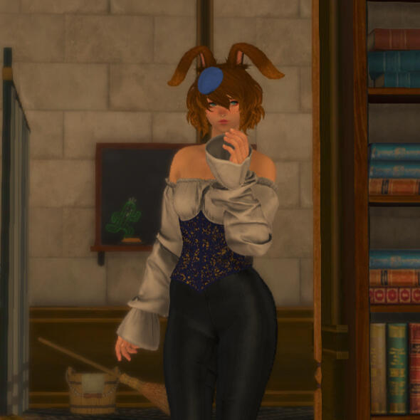 This small but energetic popoto is a long-standing friend, ready to embrace violence if necessary to protect the bnnuy. This willingness earned Ethel's trust and gratefulness after a peculiar incident involving a very indelicate viera male. Her cozy library coffee became the safe spot Ethel enjoys visiting on a regular basis.