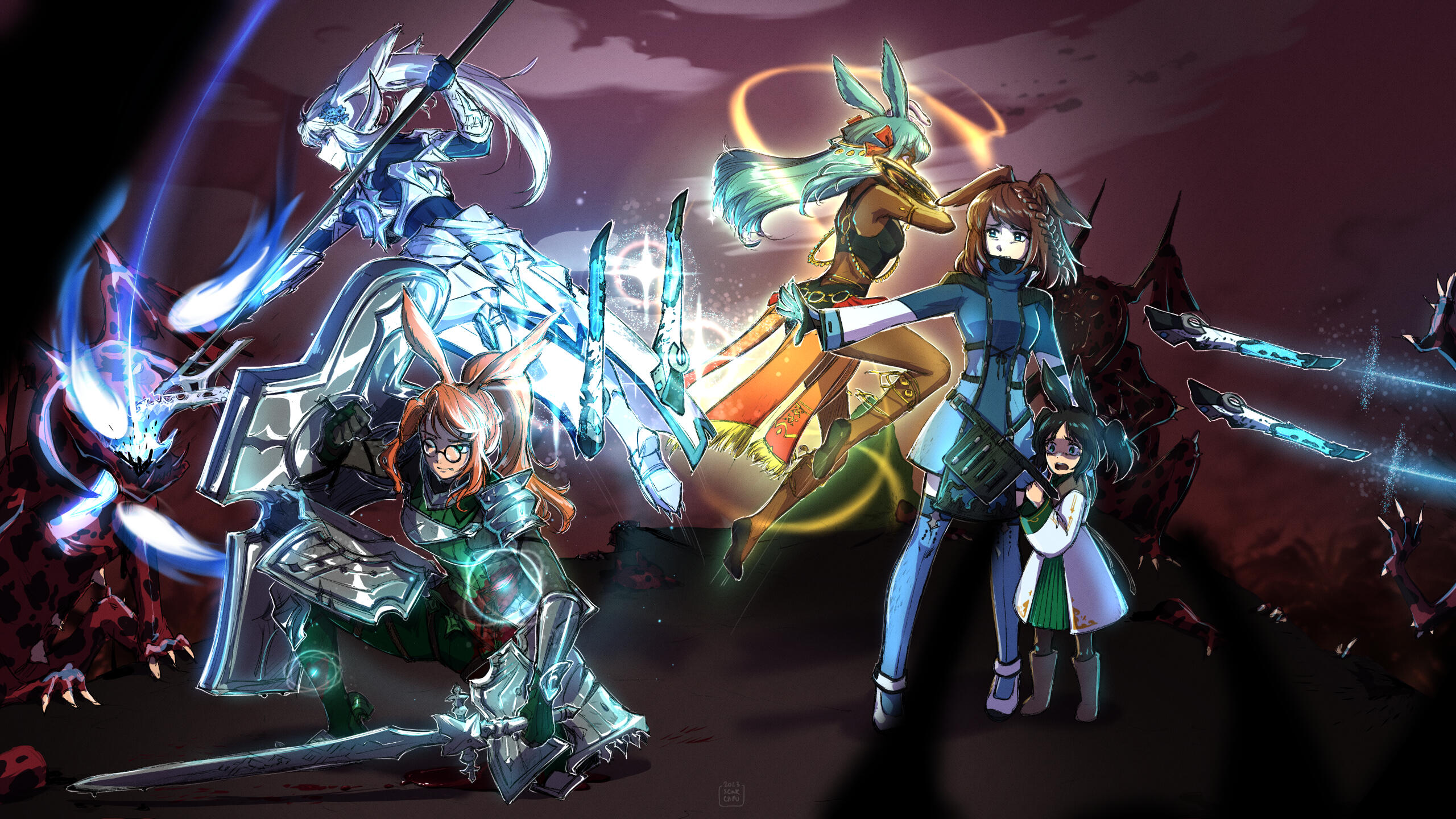 Alas, Isghard was facing its direst hour in the millennia old war against the dragons. No effort could be spared to keep the heretics and the archenemy Nidhogg's brood away from the Holy City. Templier and knights order were stretched thin, in urgent need of fresh arms… And so, a morning, a pair of soldiers knocked at Yvain’s door. It was fairly known he hosted a stranger, now requisitioned to fight or be expelled. Despite his protests, Ethel was taken in the templier retinues, and called to serve in the rear-line auxiliaries.Once again, fate proved to be the cruellest master. The dragoon she owned rude rescue spotting her on the training ground and decided to beat some sense in this stranger, perhaps out of jealousy or just plain pettiness. To his displeasure, the basics taught by Yvain and her strong affinity to wind aether allowed her to resist few blow… And made the dragon's relic he carried react. Turned out the poor excuse of a woman was compatible in a time of need, and so brought in the Azure Dragoon order despite being a stranger. However, she'd never be recognized as an equal nor equipped with a dragon blooded armor.Instead, she was sent with the other aliens, outcasts and misfits conscripted like her. More than a hundred souls left with little choice than dying alone, or together for the Holy City with distant promise of amnesty or citizenship if they ever managed to survive long enough. Only the most dangerous missions were given to those Unsung Spears, deep strikes in enemy-held territories, ambush, assassinations… By owning a job crystal, Ethel was put in as a lieutenant, with the difficult mission to keep in check the other crystal wielders of sinister reputation. Dark knights, tempering with the same energy than the hated demons summoned by heretics.She saw the horrors of war, people once brothers tearing each other apart, innocents slaughtered. Worst was the massacre of Gargogne, Yvain’s birthplace ; even today the unspeakable horrors seep in her nightmares. But she also found slivers of relief in the camaraderie from fellow brothers and sisters in arms, while other made her days -and nights- true ordeals.Far from this harsh reality, denizens who glimpsed at the white and silent dragoon shrouded by snow started to speak of the Snow Hare, telling their children about this strange but benevolent guardian punishing Isghard’s foes in the blizzard. A tale was born, fragment of hope given in dark hours. Something she couldn’t be aware of.All ended in the last days of the Dragonsong War, when a returned Nidhogg darkened the sky with his brood to scorch the Holy City. Trying to reach collapsing defence lines after a deployment in Dravania, the Unsung Spears’ company aircraft was attacked by a splinter wing of ebony dragons. Crashing in the highlands, many were killed on the spot… alongside the leader and most of the veterans. Ethel made it, although injured, only to realize command befell on her shoulder.Surrounded, cut from any allies, she had to give the worst and only order she never gave. She asked them to die here, taking with them as much winged fiend as possible to relieve the Holy City defenders. And thus the Spears were shattered, unsung valor and bravery with only the tainted snow to remember. For a time, they held thigh, the wreck of their airship makeshift bastion. Until a massive dragon came to end it all, engaging Ethel… A fight she knew she couldn't win. With all her remaining strength she aimed for the beast’s heart, but failed to deal the killing blow. Both fighters fell from the steep cliff, plunging to their death far from the slaughter.